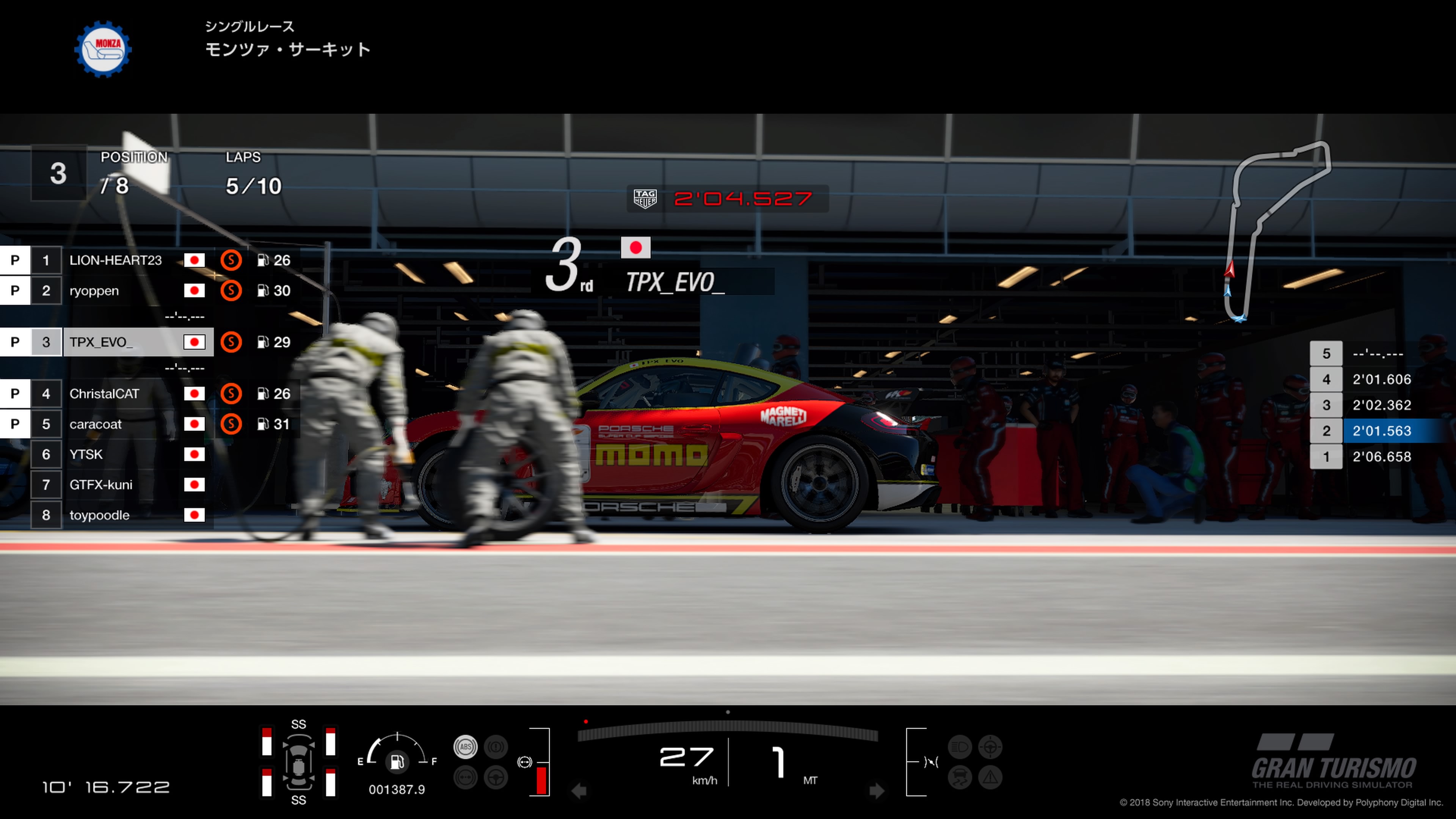 3周目の1コーナーでEVO選手がライオン選手をパスしますが大勢に影響なし。